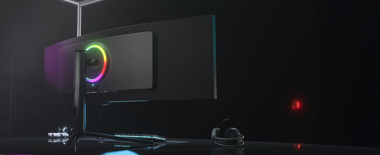 Enhance your setup with stylish RGB lighting that adds atmosphere to your space. Enjoy clear and powerful sound with built-in speakers.